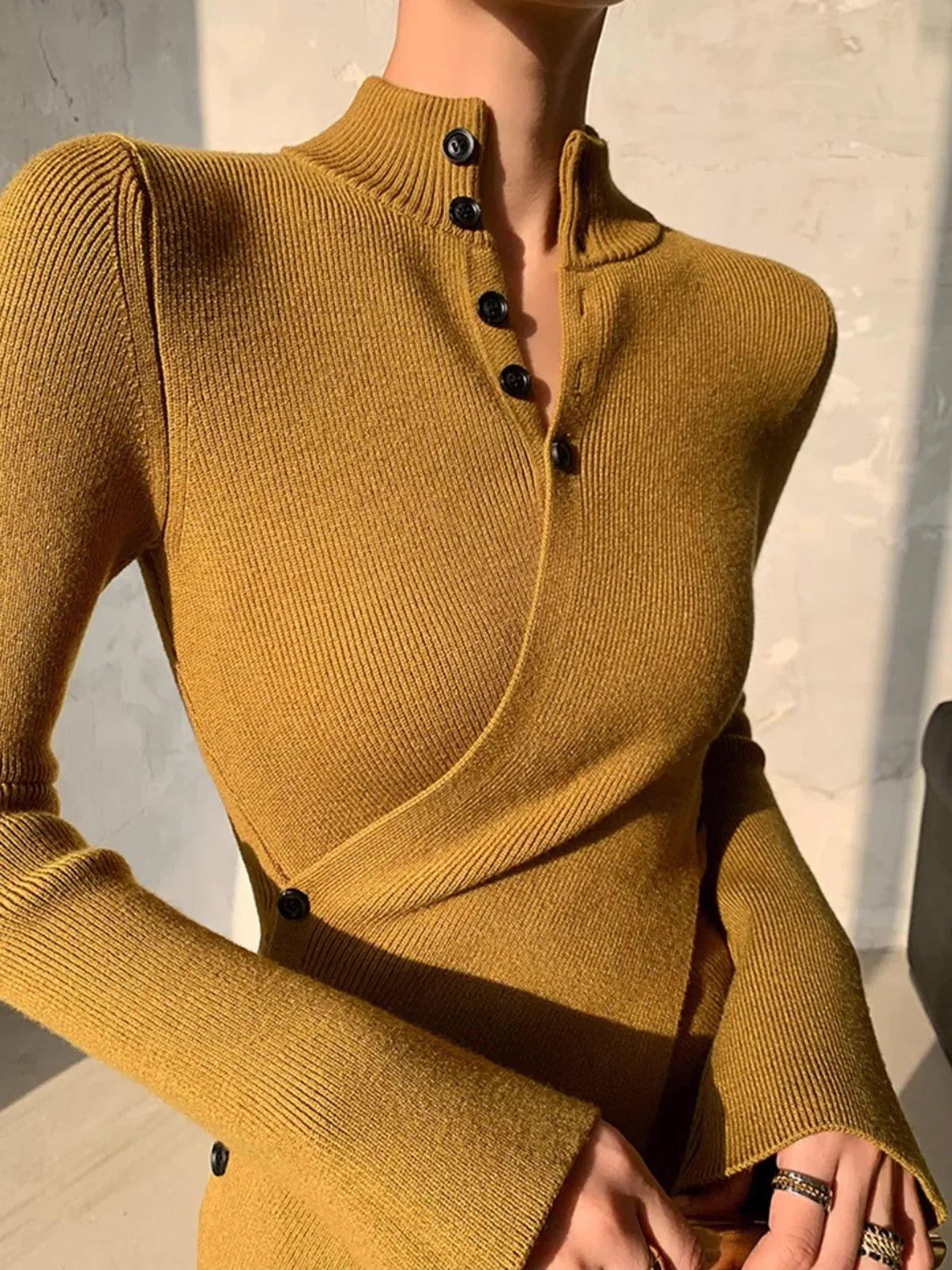 • Design Details: Opvallende knopenrij langs hals en taille, lange mouwen
