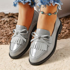 Deze elegante loafers zijn perfect voor een chique en moderne uitstraling. Het PU lederen materiaal met glanzende afwerking en klassieke details zoals franjes en een strik zorgen voor een verfijnde look. De comfortabele zool biedt ondersteuning, ideaal voor dagelijks gebruik.