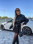 Deze oversized leren jas met een strikceintuur geeft een luxe en krachtige uitstraling. Met zijn brede revers en glanzende afwerking is dit dé must-have voor een statement look.