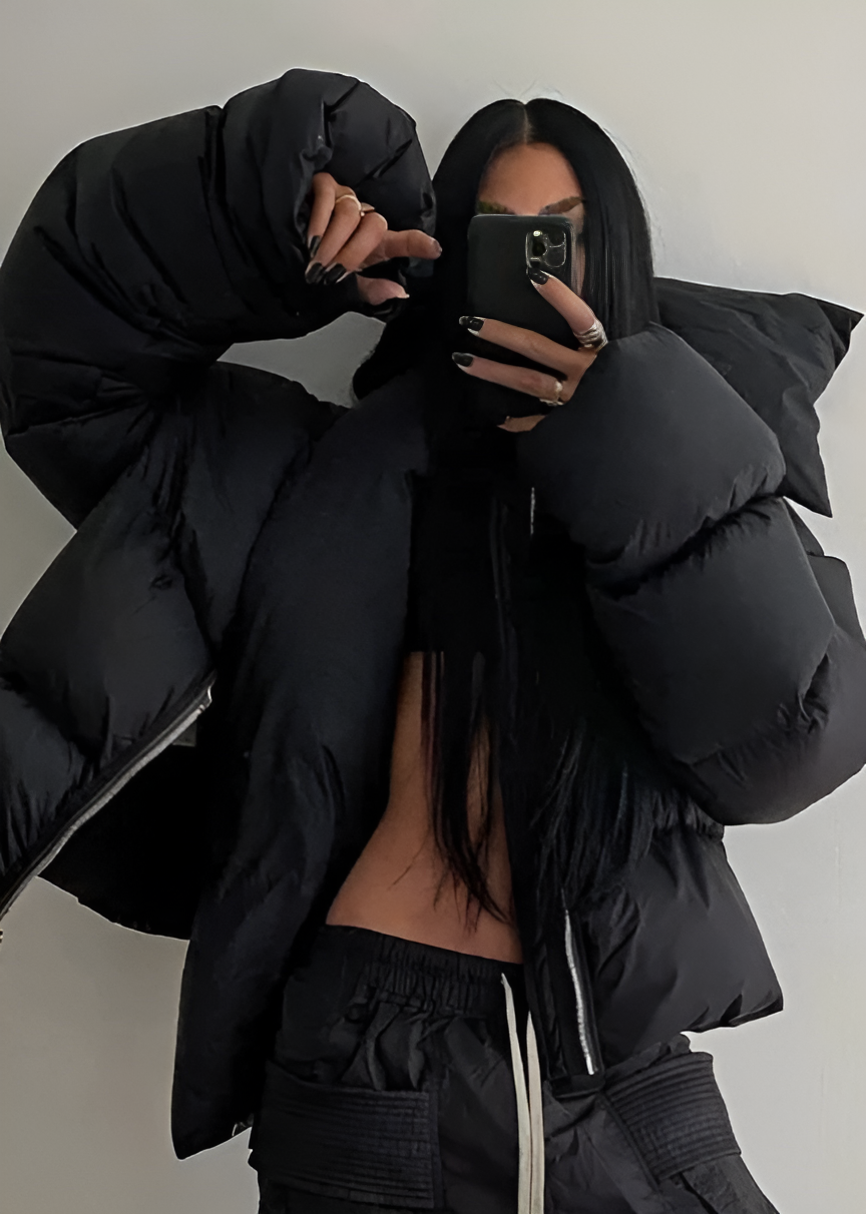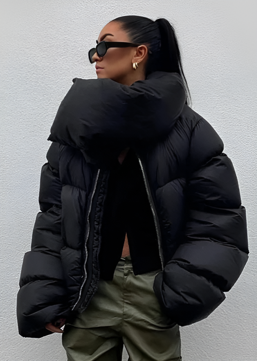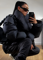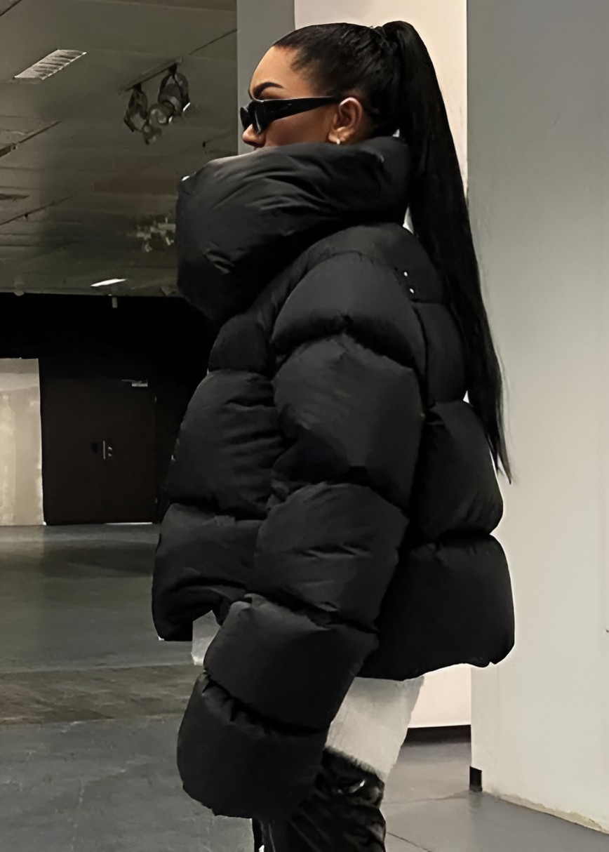Deze oversized pufferjas in diepzwart is perfect voor frisse winterochtenden en biedt maximale warmte met een modieuze edge. De volumineuze pasvorm en gewatteerde look maken het dé jas voor een streetstyle outfit met impact.