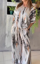 Deze tweedelige set met een losvallende blouse en een wijde broek biedt ultiem comfort en een moeiteloos chique uitstraling. De satijnachtige stof voelt zacht aan en het abstracte patroon geeft een moderne touch. Perfect voor casual dagen, vakanties of een avond uit!